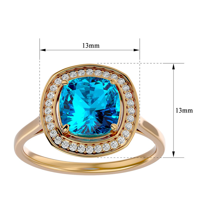 This stunning gemstone and diamond ring features one 8x8mm cushion cut blue topaz gemstone at 2.70 carats. It is surrounded by 32 sparkling diamonds in I-J color, I1-I2 clarity at 0.16 carats. Total gem weight is approximately 2 3/4 carats. This ring is crafted in 14 karat yellow gold.