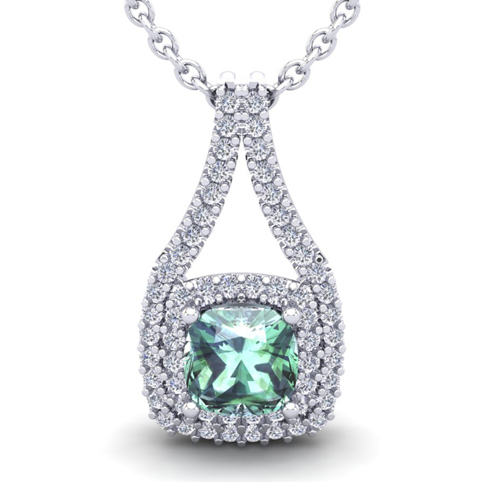 2 3/4 Carat Cushion Cut Green Amethyst and Double Halo Diamond Necklace In 14 Karat White Gold, 18 Inches