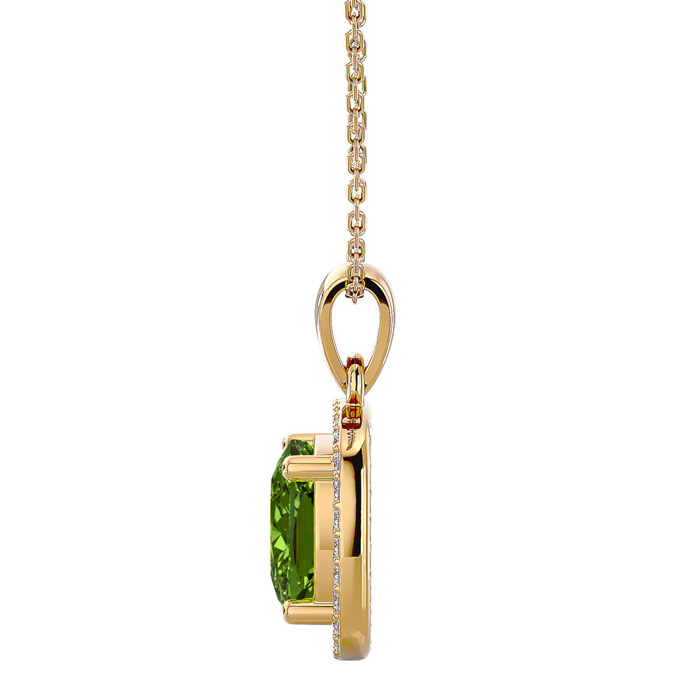 This elegant gemstone necklace features one 8mm cushion shape peridot gemstone weighing approximately 2.60 carats. It is surrounded by 28 sparkling diamonds in I-J color, I1-I2 clarity at 0.15 carats. Total gem weight is approximately 2 3/4 carats. This necklace is in 14 karat yellow gold and comes with an 18 inch chain with a spring-ring clasp.