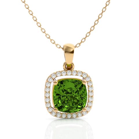 2 3/4 Carat Cushion Cut Peridot and Halo Diamond Necklace In 14 Karat Yellow Gold, 18 Inches