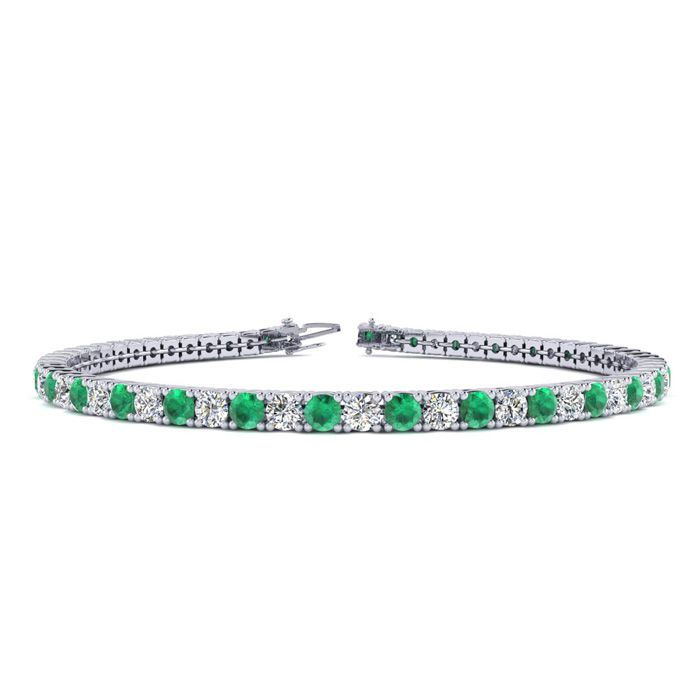 This classic gemstone bracelet features shimmering white diamonds in J-K color, I1-I2 clarity and emerald gemstones. The 6 inch bracelet contains 57 gemstones and diamonds at 2.84 carats. The 6.5 inch bracelet contains 62 gemstones and diamonds at 3.10 carats. The 7 inch bracelet contains 67 gemstones and diamonds at 3.34 carats. The 7.5 inch bracelet contains 72 gemstones and diamonds at 3.60 carats. The 8 inch bracelet contains 76 gemstones and diamonds at 3.80 carats. The 8.5 inch bracelet contains 81 gemstones and diamonds at 4.04 carats. The 9 inch bracelet contains 86 gemstones and diamonds at 4.30 carats. This bracelet is approximately 2.25mm wide and is crafted in 14 karat white gold. This bracelet has a secure, box with tongue and safety clasp.