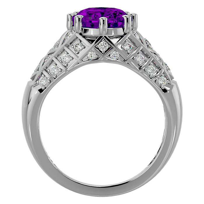 This stunning gemstone and diamond ring features one 10x8mm oval shape amethyst gemstone at 2.35 carats. It is surrounded by 38 sparkling diamonds in I-J color, I1-I2 clarity at 0.38 carats. Total gem weight is 2.73 carats. This ring is crafted in 10 karat white gold.