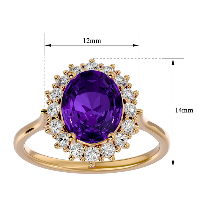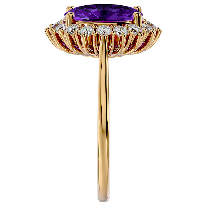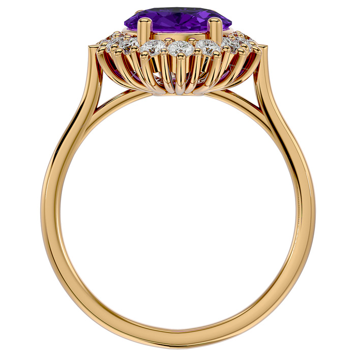 This elegant gemstone ring features one 10x8mm oval shape amethyst gemstone at approximately 2 1/3 carats. It is surrounded by 16 sparkling diamonds in I-J color, I1-I2 clarity at 1/2 carat total weight. Total gem weight is approximately 2 3/4 carats. This ring is in 14 karat yellow gold.