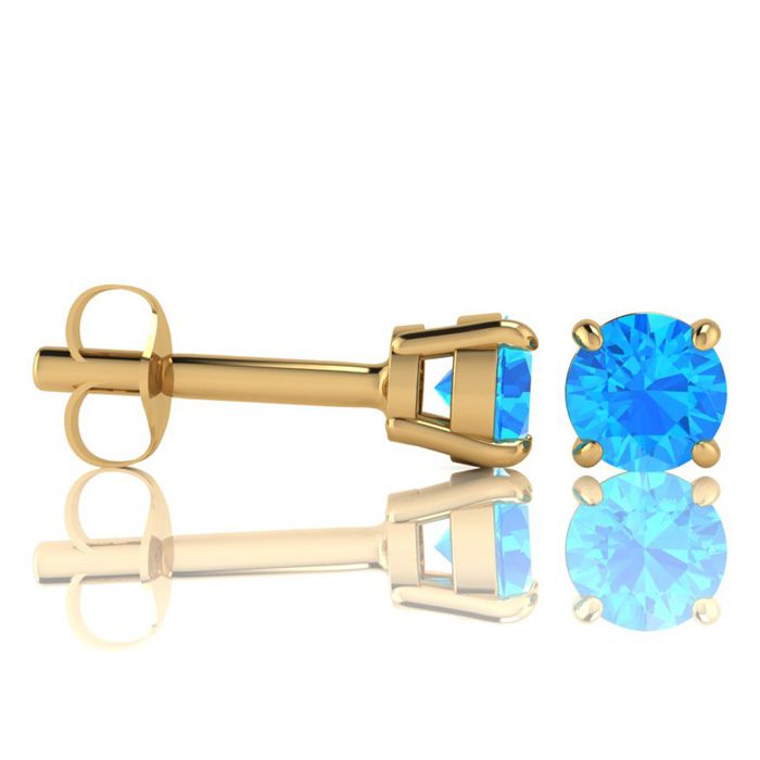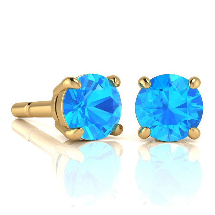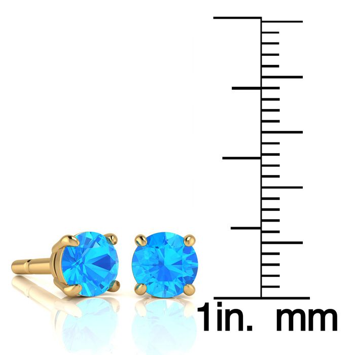 These classic stud earrings feature two 6x6mm round shape blue topaz gemstones. Each stone measures approximately 1.39 carats for a total approximate weight of 2.78 carats. These earrings are in 14 karat yellow gold over sterling silver and have comfortable and secure post with friction backs.