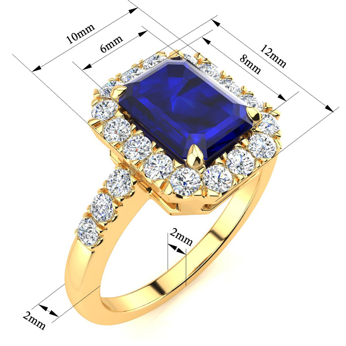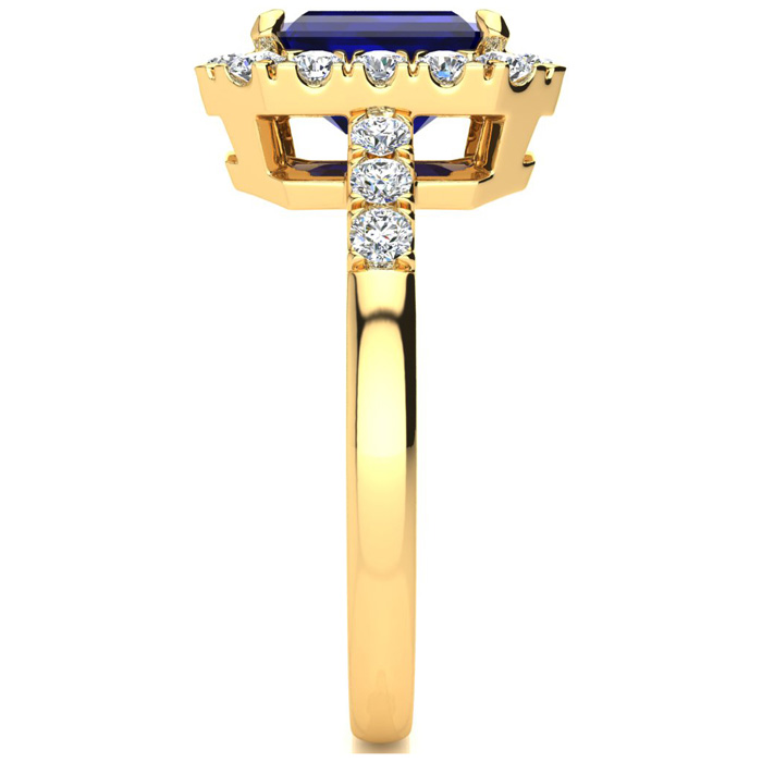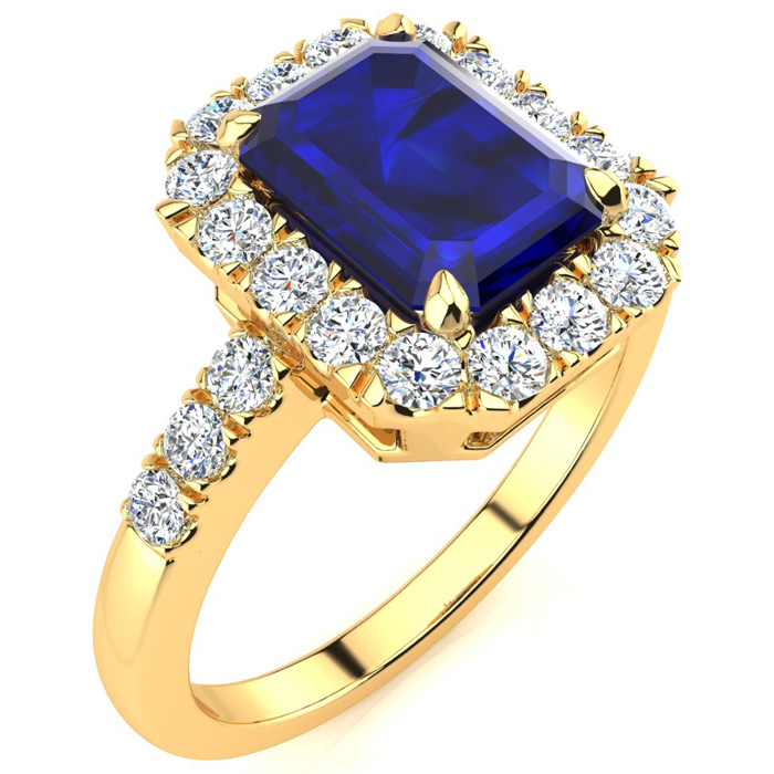 This stunning gemstone and diamond ring features one 8x6mm emerald cut sapphire gemstone at 2.20 carats. It is surrounded by 24 sparkling diamonds in a halo and down the band in I-J color, I1-I2 clarity at 0.54 carats. Total gem weight is 2.74 carats. This ring is crafted in 14 karat yellow gold.