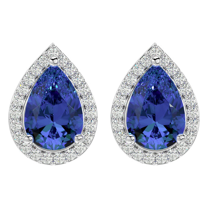 These elegant gemstone earrings feature two 9x6mm pear shape tanzanite gemstones at approximately 2.60 carats. They are surrounded by 48 sparkling diamonds in I-J color, I1-I2 clarity at 1/4 carat total weight. Total gem weight is approximately 2 3/4 carats. These earrings are in 14 karat white gold and have comfortable and secure friction backs. *Retrograde Birthstones™ flips the idea of traditional birthstones. Wear your ½ birthday birthstone, your Retrograde Birthstone, “The Birthstone For Your Bad Side™.