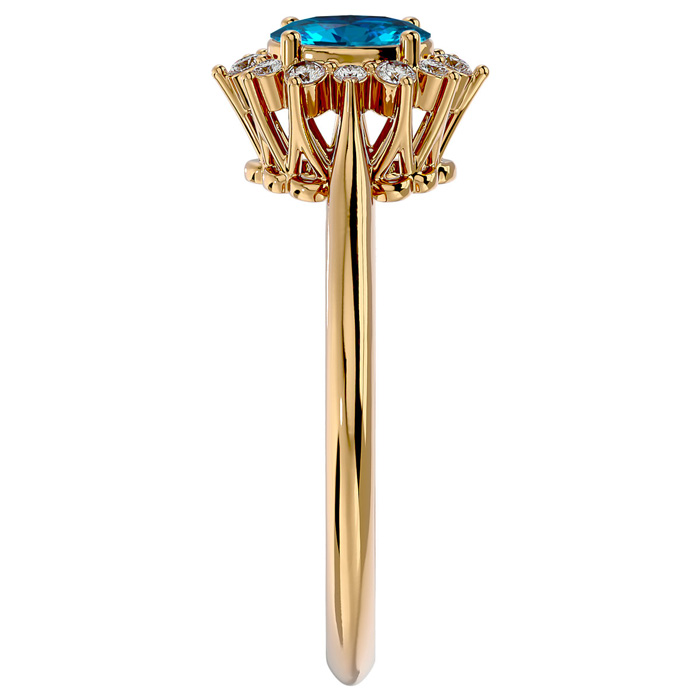 This elegant gemstone ring features one 6x4mm oval shape blue topaz gemstone at approximately 1/2 carat. It is surrounded by 12 sparkling diamonds in I-J color, I1-I2 clarity at 0.15 carat total weight. Total gem weight is approximately 2/3 carats. This ring is in 14 karat yellow gold.