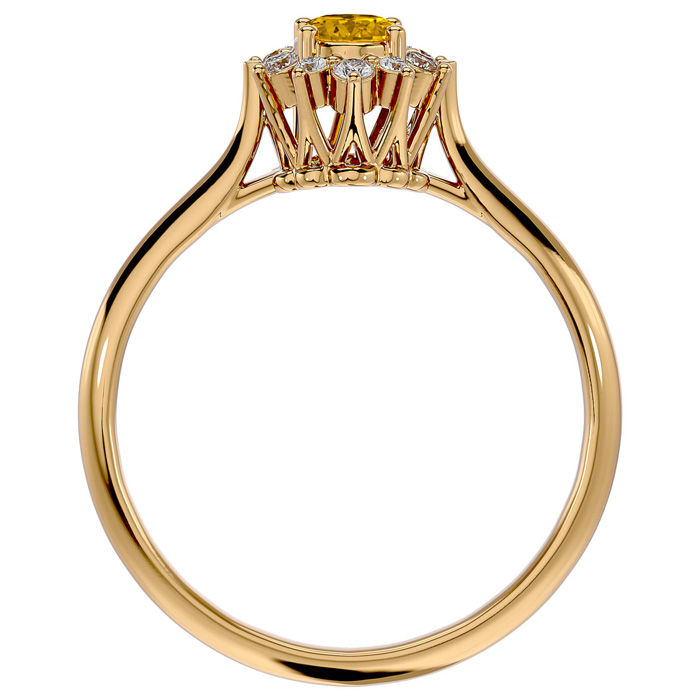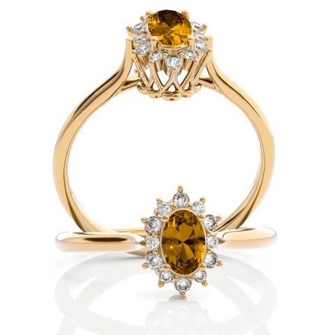 This elegant gemstone ring features one 6x4mm oval shape citrine gemstone at approximately 1/2 carat. It is surrounded by 12 sparkling diamonds in I-J color, I1-I2 clarity at 0.15 carat total weight. Total gem weight is approximately 2/3 carats. This ring is in 14 karat yellow gold.