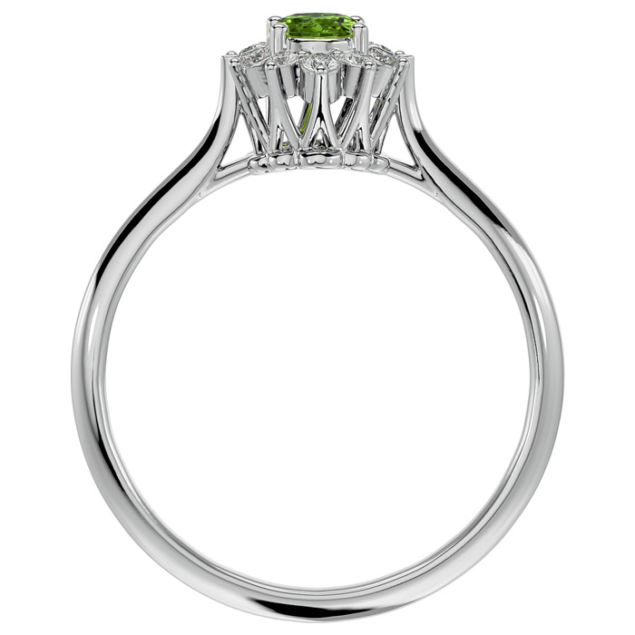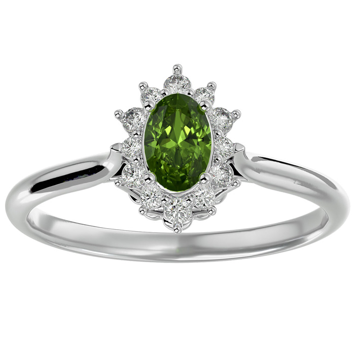 This elegant gemstone ring features one 6x4mm oval shape peridot gemstone at approximately 1/2 carat. It is surrounded by 12 sparkling diamonds in I-J color, I1-I2 clarity at 0.15 carat total weight. Total gem weight is approximately 2/3 carats. This ring is in 14 karat white gold.