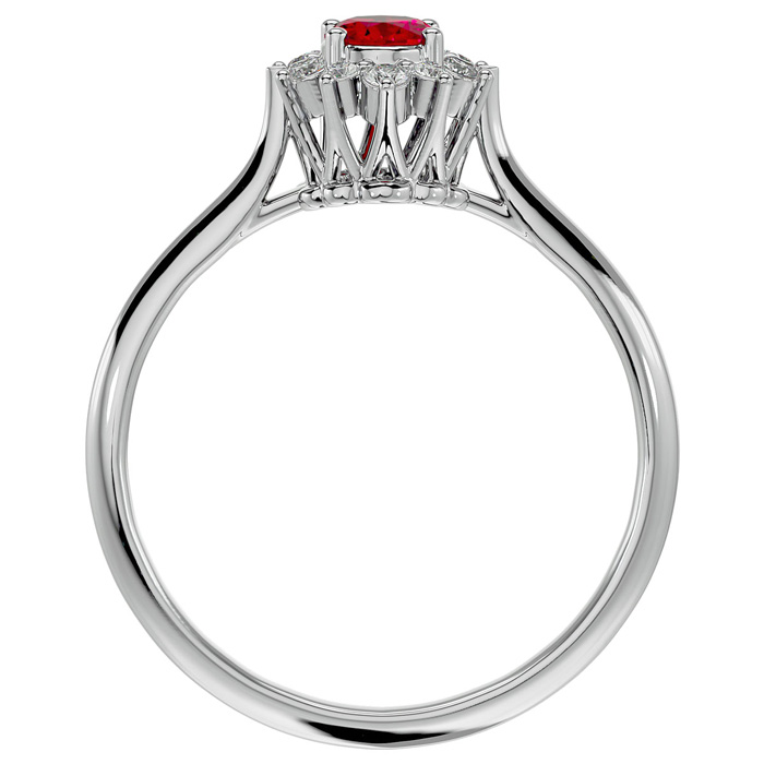 This elegant gemstone ring features one 6x4mm oval shape ruby gemstone at approximately 1/2 carat. It is surrounded by 12 sparkling diamonds in I-J color, I1-I2 clarity at 0.15 carat total weight. Total gem weight is approximately 2/3 carats. This ring is in 14 karat white gold.