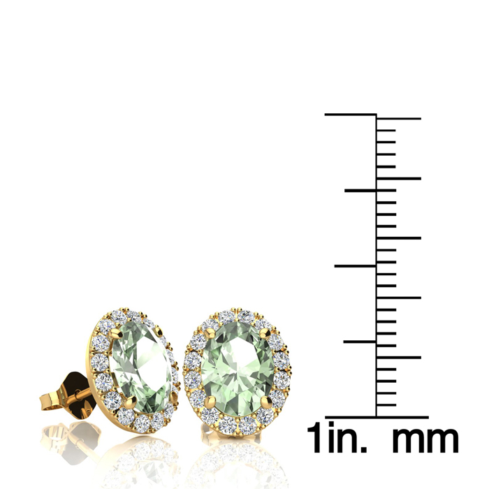These stunning gemstone and halo diamond earrings feature two 8x6mm oval shape green amethyst gemstones at 2.10 carats. They are surrounded by 40 sparkling diamonds in I-J color, I1-I2 clarity at 0.28 carats. Total gem weight is 2.38 carats. These earrings are crafted in 14 karat yellow gold and have comfortable and secure post with friction backs.