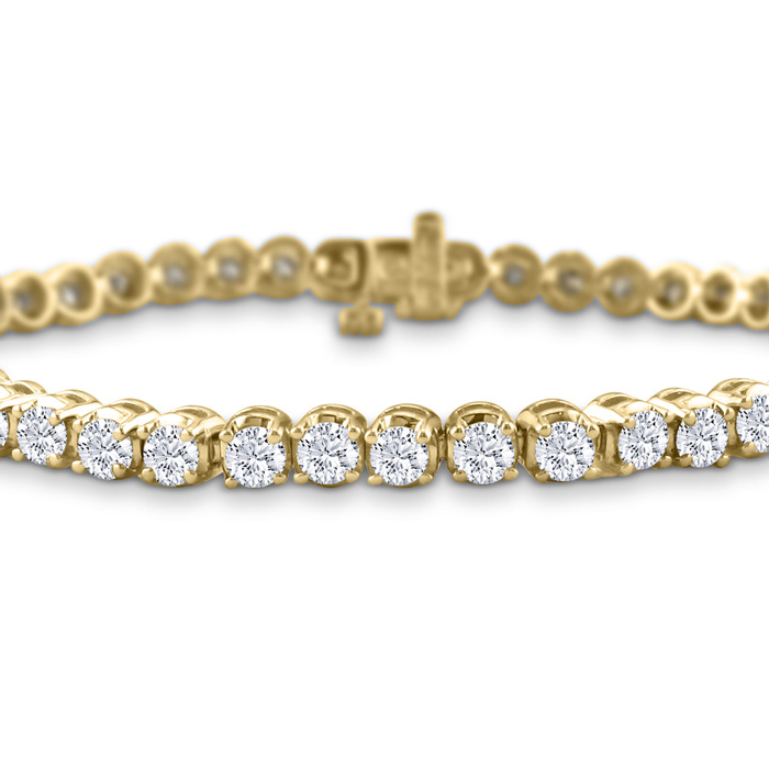 Very hard-to-find round base 6-inch diamond tennis bracelet, yet the classic 2.56ct diamond tennis bracelet style, set in a fine 14 karat Yellow gold mounting with our pretty I/J color, I2 diamonds. Limited supply on these diamond tennis bracelets.