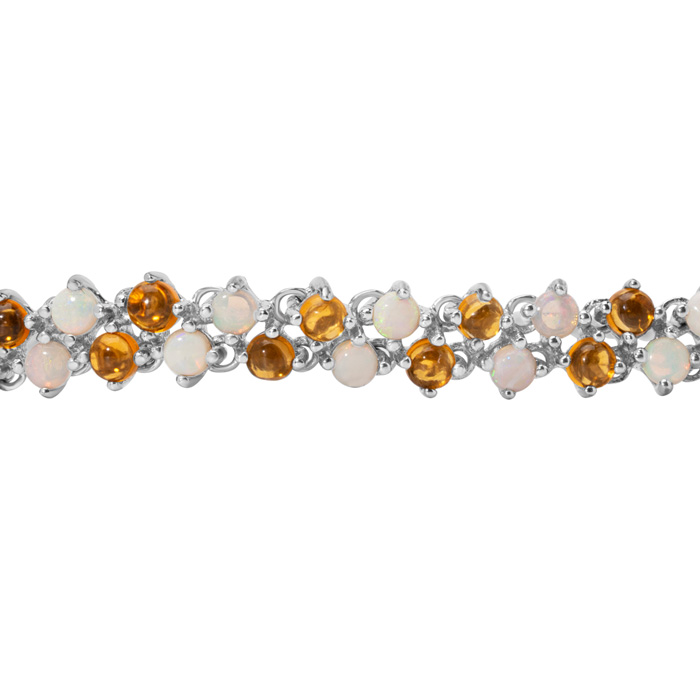 This incredible bracelet features stunning citrine and white opal gemstones totaling 2.70 carats. They are arranged in a cluster measuring 5mm wide. This bracelet is in sterling silver. The bolo style bracelet is adjustable up to 9 inches and will fit every wrist size!