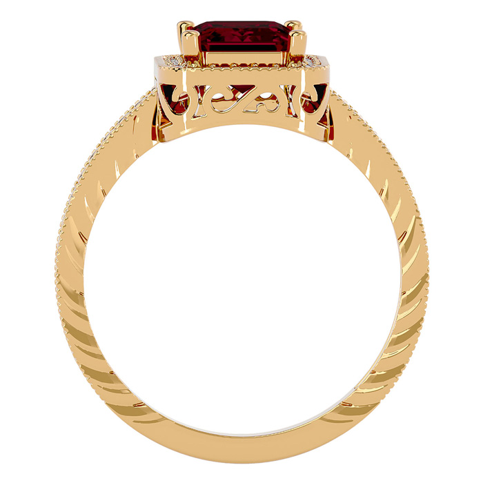 This antique style gemstone ring features an 8x6mm emerald cut ruby gemstone weighing approximately 1 3/4 carats. There are 26 side diamonds in I-J color, I1-I2 clarity totaling approximately 1/5 carat. Total carat weight is approximately 2 carats. This ring is in 14 karat yellow gold.