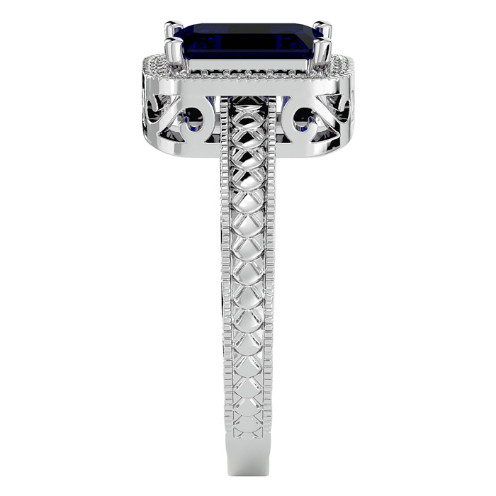 This antique style gemstone ring features an 8x6mm emerald cut sapphire gemstone weighing approximately 1 3/4 carats. There are 38 side diamonds in I-J color, I1-I2 clarity totaling approximately 1/5 carat. Total carat weight is approximately 2 carats. This ring is in 14 karat white gold.