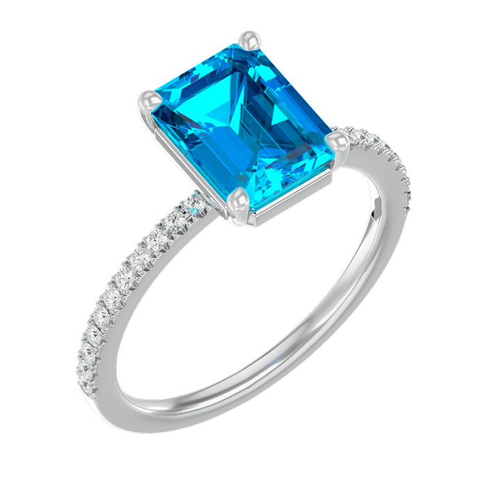 This stunning gemstone and diamond ring features one 8x6mm emerald shape blue topaz gemstone at 1.90 carats. It is surrounded by 22 sparkling diamonds along the band in I-J color, I1-I2 clarity at 0.18 carats. Total gem weight is 2.08 carats. This ring is crafted in 14 karat white gold.