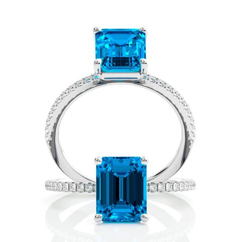 This stunning gemstone and diamond ring features one 8x6mm emerald shape blue topaz gemstone at 1.90 carats. It is surrounded by 22 sparkling diamonds along the band in I-J color, I1-I2 clarity at 0.18 carats. Total gem weight is 2.08 carats. This ring is crafted in 14 karat white gold.