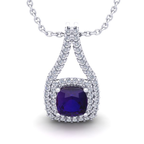 2 Carat Cushion Cut Amethyst and Double Halo Diamond Necklace In 14 Karat White Gold, 18 Inches
