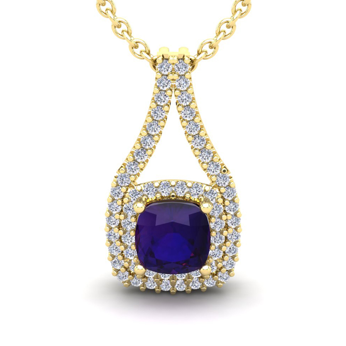 2 Carat Cushion Cut Amethyst and Double Halo Diamond Necklace In 14 Karat Yellow Gold, 18 Inches