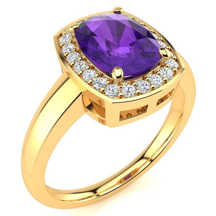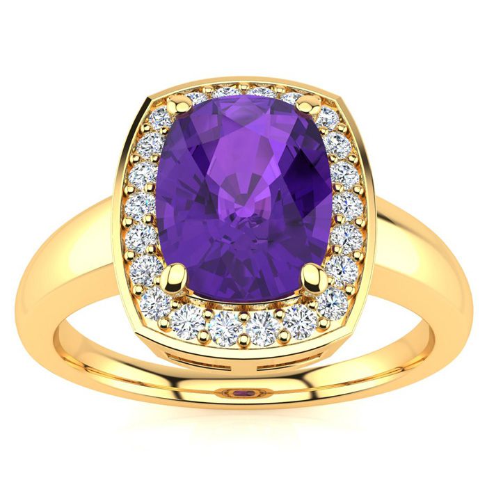 This stunning gemstone and diamond ring features one 9x7mm cushion shape amethyst gemstone at 2.00 carats. It is surrounded by 22 sparkling diamonds in I-J color, I1-I2 clarity at 0.15 carats. Total gem weight is 2.15 carats. This ring is crafted in 14 karat yellow gold.