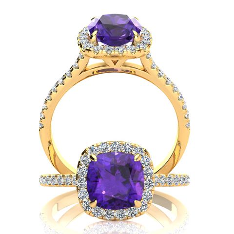 2 Carat Cushion Cut Amethyst and Halo Diamond Ring In 14K Yellow Gold