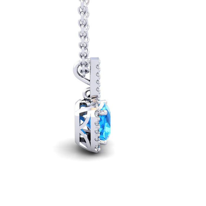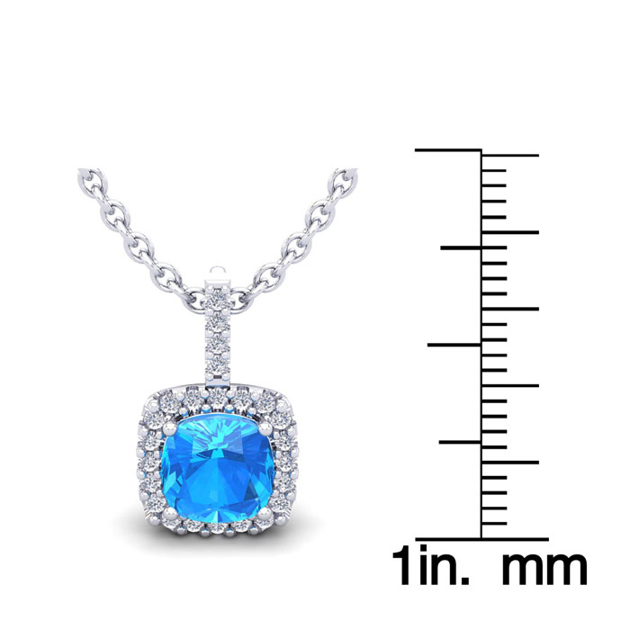 This stunning gemstone and halo diamond necklace features one 7x7mm cushion cut blue topaz gemstone at 1.74 carats. It is surrounded by 24 sparkling diamonds in a halo in I-J color, SI2-I1 clarity at 0.24 carats. Total gem weight is 1.98 carats. This necklace is crafted in 14 karat white gold and comes with an 18 inch cable chain with spring-ring clasp.
