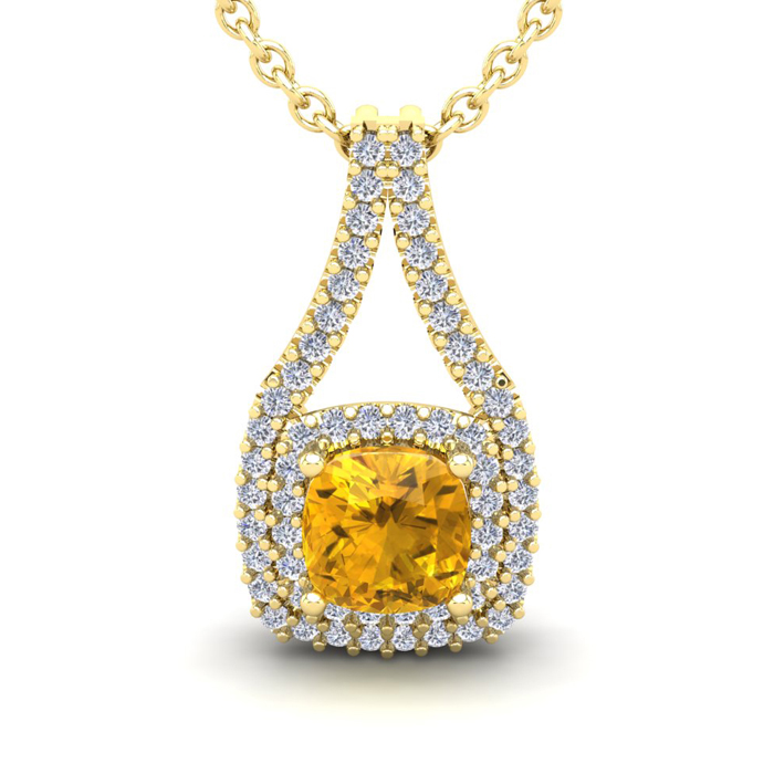 This stunning gemstone and halo diamond necklace features one 7x7mm cushion cut citrine gemstone at 1.50 carats. It is surrounded by 58 sparkling diamonds in a halo in I-J color, SI2-I1 clarity at 0.58 carats. Total gem weight is 2.08 carats. This necklace is crafted in 14 karat yellow gold and comes with an 18 inch cable chain with spring-ring clasp.