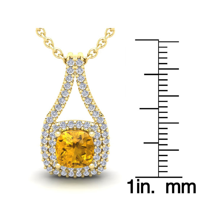 2 Carat Cushion Cut Citrine and Double Halo Diamond Necklace In 14 Karat Yellow Gold, 18 Inches