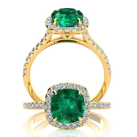 2 Carat Cushion Cut Emerald and Halo Diamond Ring In 14K Yellow Gold