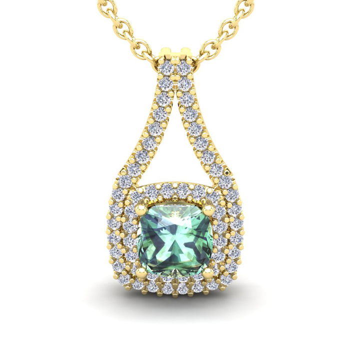 This stunning gemstone and halo diamond necklace features one 7x7mm cushion cut green amethyst gemstone at 1.32 carats. It is surrounded by 58 sparkling diamonds in a halo in I-J color, SI2-I1 clarity at 0.58 carats. Total gem weight is 1.90 carats. This necklace is crafted in 14 karat yellow gold and comes with an 18 inch cable chain with spring-ring clasp.