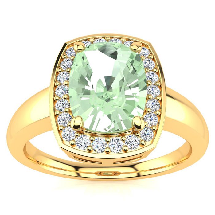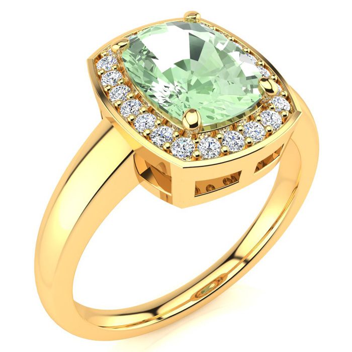 2 Carat Cushion Cut Green Amethyst and Halo Diamond Ring In 14 Karat Yellow Gold