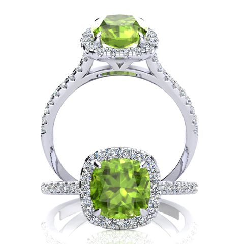 2 Carat Cushion Cut Peridot and Halo Diamond Ring In 14K White Gold