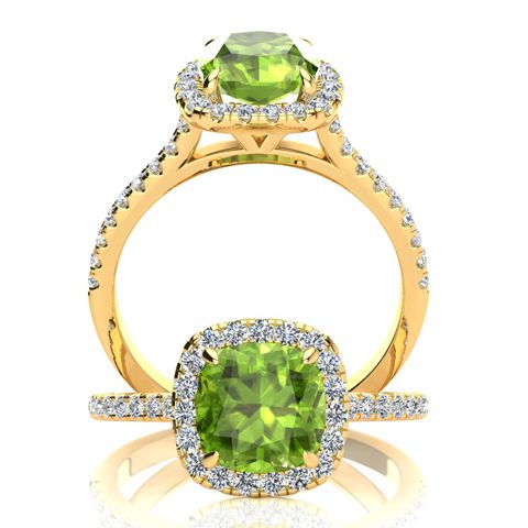 2 Carat Cushion Cut Peridot and Halo Diamond Ring In 14K Yellow Gold