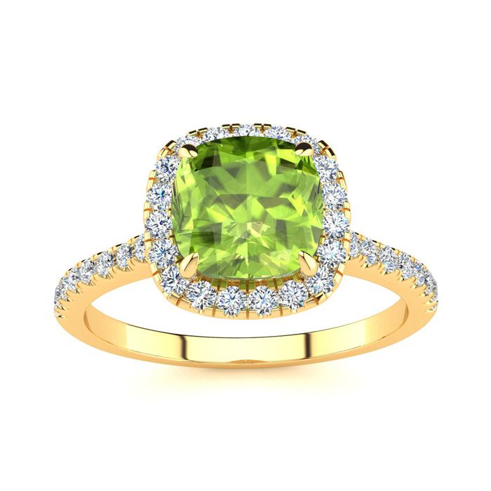 2 Carat Cushion Cut Peridot and Halo Diamond Ring In 14K Yellow Gold