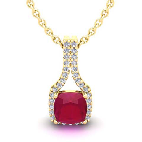 This stunning gemstone and halo diamond necklace features one 7x7mm cushion cut created ruby gemstone at 1.77 carats. It is surrounded by 33 sparkling diamonds in a halo in I-J color, SI2-I1 clarity at 0.33 carats. Total gem weight is 2.10 carats. This necklace is crafted in 14 karat yellow gold and comes with an 18 inch cable chain with spring-ring clasp.