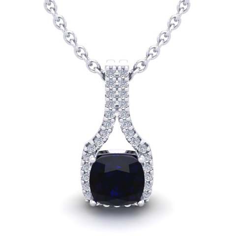 This stunning gemstone and halo diamond necklace features one 7x7mm cushion cut created sapphire gemstone at 1.77 carats. It is surrounded by 33 sparkling diamonds in a halo in I-J color, SI2-I1 clarity at 0.33 carats. Total gem weight is 2.10 carats. This necklace is crafted in 14 karat white gold and comes with an 18 inch cable chain with spring-ring clasp.
