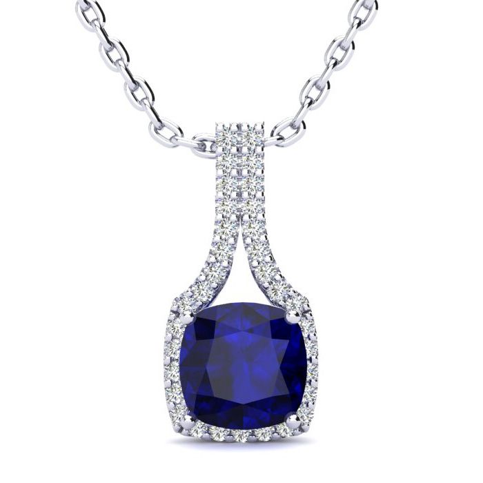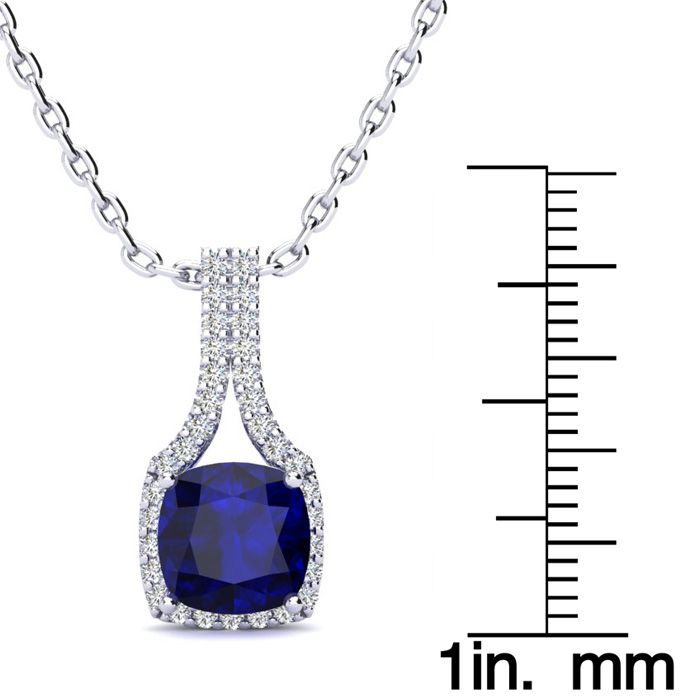 2 Carat Cushion Cut Sapphire and Classic Halo Diamond Necklace In 14 Karat White Gold, 18 Inches