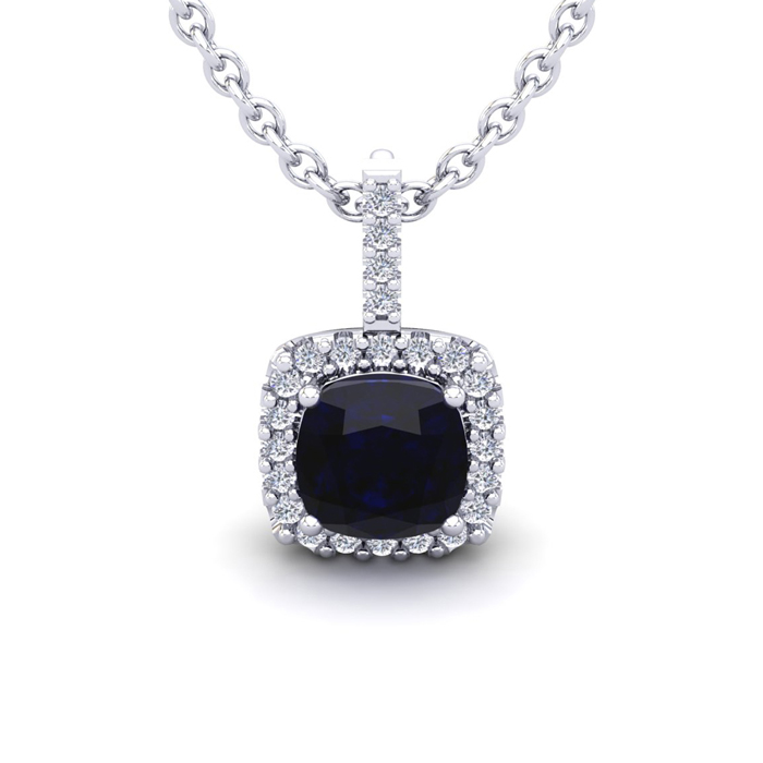 2 Carat Cushion Cut Sapphire and Halo Diamond Necklace In 14 Karat White Gold, 18 Inches