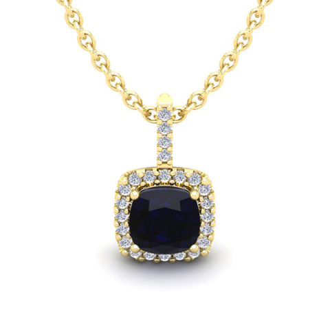 2 Carat Cushion Cut Sapphire and Halo Diamond Necklace In 14 Karat Yellow Gold, 18 Inches