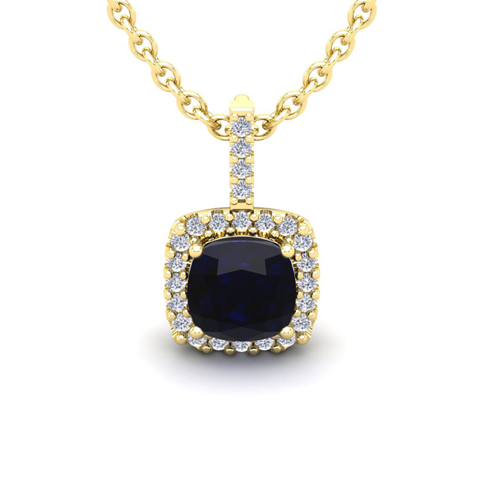 2 Carat Cushion Cut Sapphire and Halo Diamond Necklace In 14 Karat Yellow Gold, 18 Inches