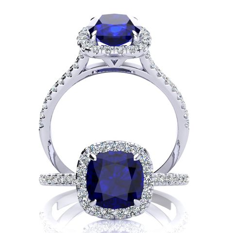 2 Carat Cushion Cut Sapphire and Halo Diamond Ring In 14K White Gold