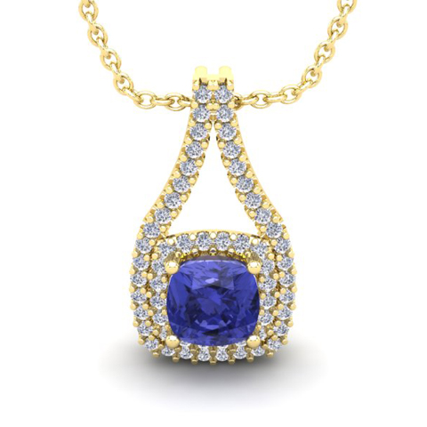 This stunning gemstone and halo diamond necklace features one 7x7mm cushion cut tanzanite gemstone at 1.50 carats. It is surrounded by 58 sparkling diamonds in a halo in I-J color, SI2-I1 clarity at 0.58 carats. Total gem weight is 2.08 carats. This necklace is crafted in 14 karat yellow gold and comes with an 18 inch cable chain with spring-ring clasp.