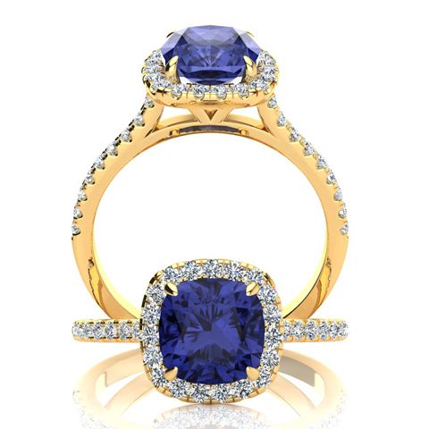2 Carat Cushion Cut Tanzanite and Halo Diamond Ring In 14K Yellow Gold