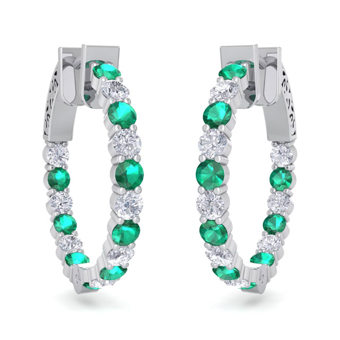 These classic hoop earrings feature 17 sparkling diamonds in J-K color, I2-I3 clarity and 17 emerald gemstones. Total carat weight is 2 carats. These earrings are in 14 karat white gold and have secure hidden snap backs. These earrings are 3/4 inch in diameter.