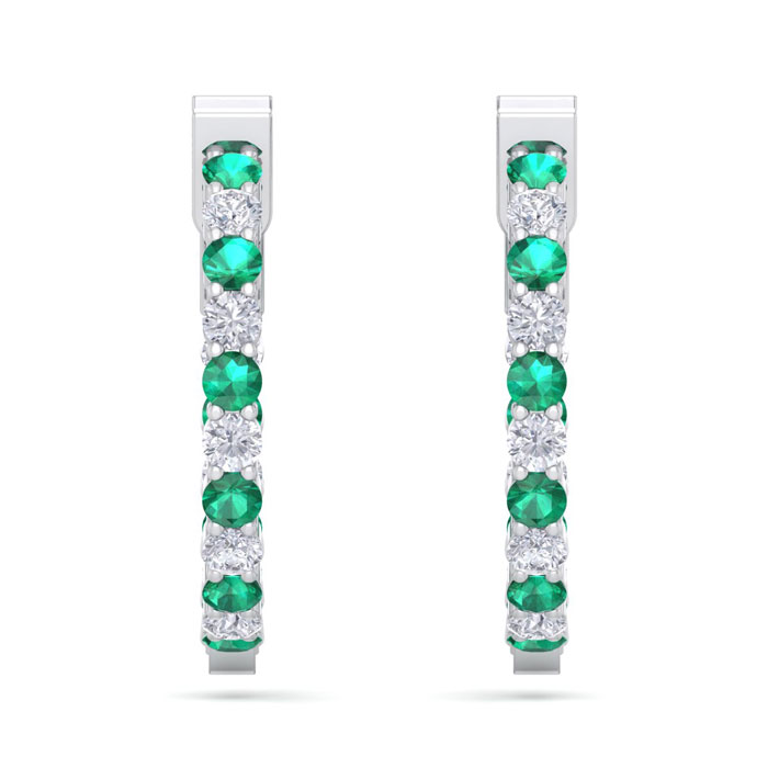 2 Carat Emerald and Diamond Hoop Earrings In 14 Karat White Gold, 3/4 Inch
