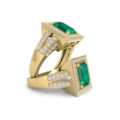 This elegant gemstone and diamond ring features one 8x6mm emerald cut emerald gemstone at approximately 1.40 carats. It is surrounded by 80 sparkling diamonds in I-J color, I1-I2 clarity at 2/3 carat total weight. Total gem weight is approximately 2 carats. This ring is in 14 karat yellow gold.