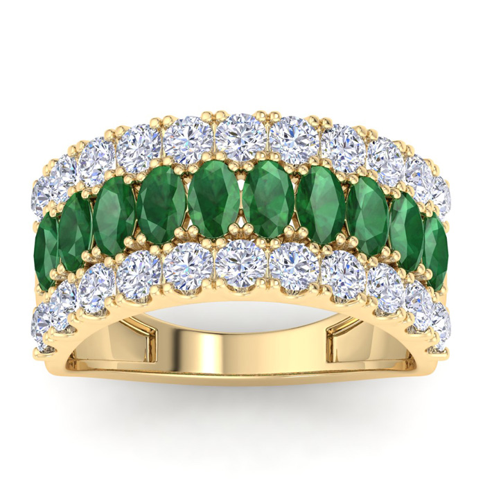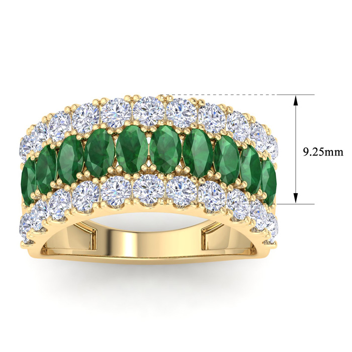 This emerald and lab grown diamond ring features 22 round shape lab grown diamonds and 10 oval shape emerald gemstones totaling approximately 2 carats. Diamond color is G-H, diamond clarity is VS. This ring is in 14 karat yellow gold. This ring is 9mm wide.