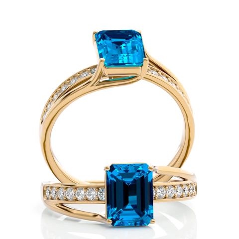 2 Carat Emerald Shape Blue Topaz and Diamond Ring In 14 Karat Yellow Gold