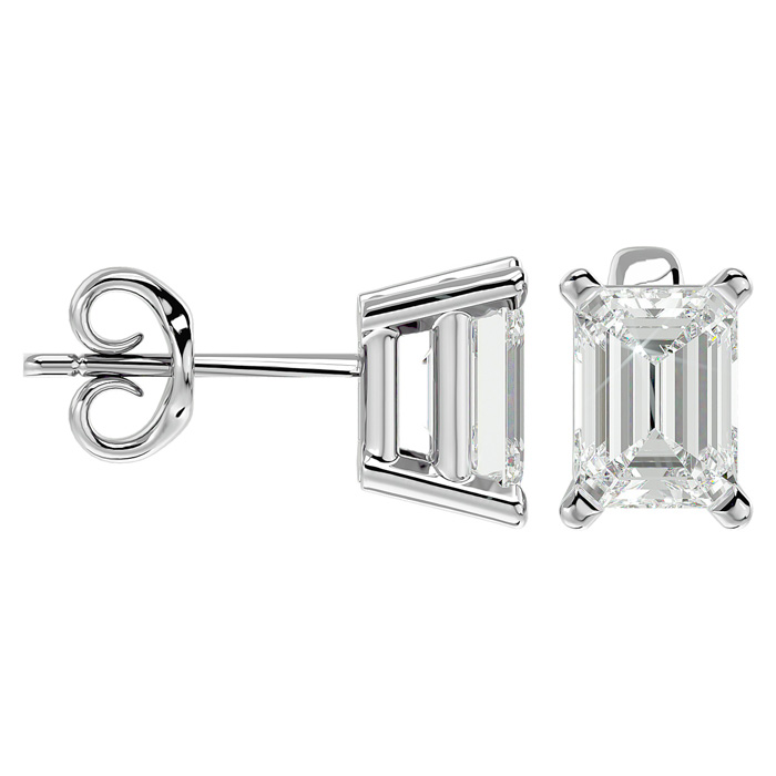 These classic moissanite stud earrings feature two 8x6mm emerald shape moissanite gemstones in E-F color, VVS1-VVS2 clarity. Each moissanite weighs approximately 1 carat for a total weight of 2 carats. These earrings are in 14 karat white gold and have comfortable and secure post with friction backs.