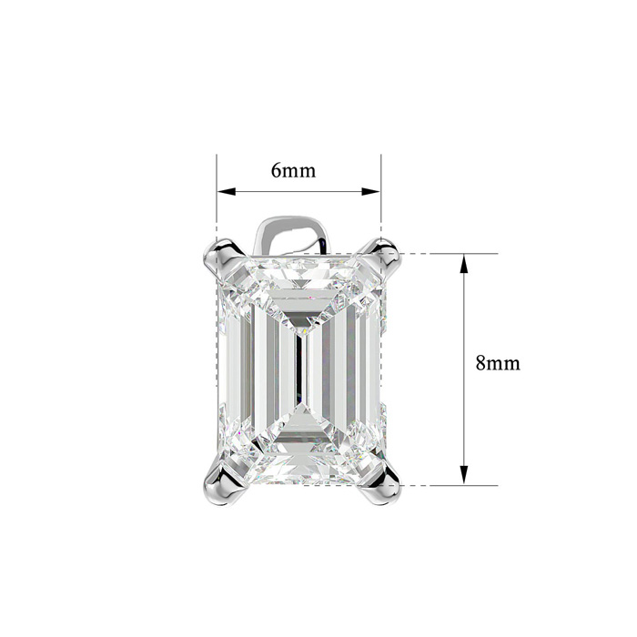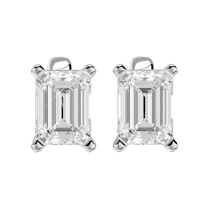 These classic moissanite stud earrings feature two 8x6mm emerald shape moissanite gemstones in E-F color, VVS1-VVS2 clarity. Each moissanite weighs approximately 1 carat for a total weight of 2 carats. These earrings are in platinum and have comfortable and secure post with friction backs.